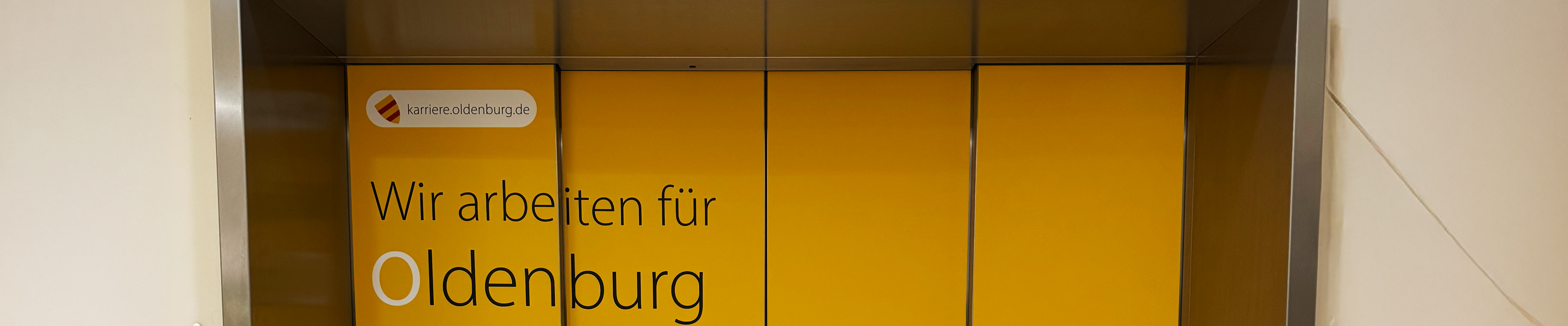 Nun ist unser Design auch vertikal mobil! Wer Lust hat, mit einer fröhlichen Feuerwehrfrau, den netten Mitarbeitenden aus dem Servicebüro oder dem Amtstierarzt mitsamt seinem Stethoskop Fahrstuhl zu fahren, geht schnell in die @schlosshoefeoldenburg. Und wer auf Jobsuche ist, findet die freien Stellen der Stadt Oldenburg über das städtische Karriereportal: karriere.oldenburg.de