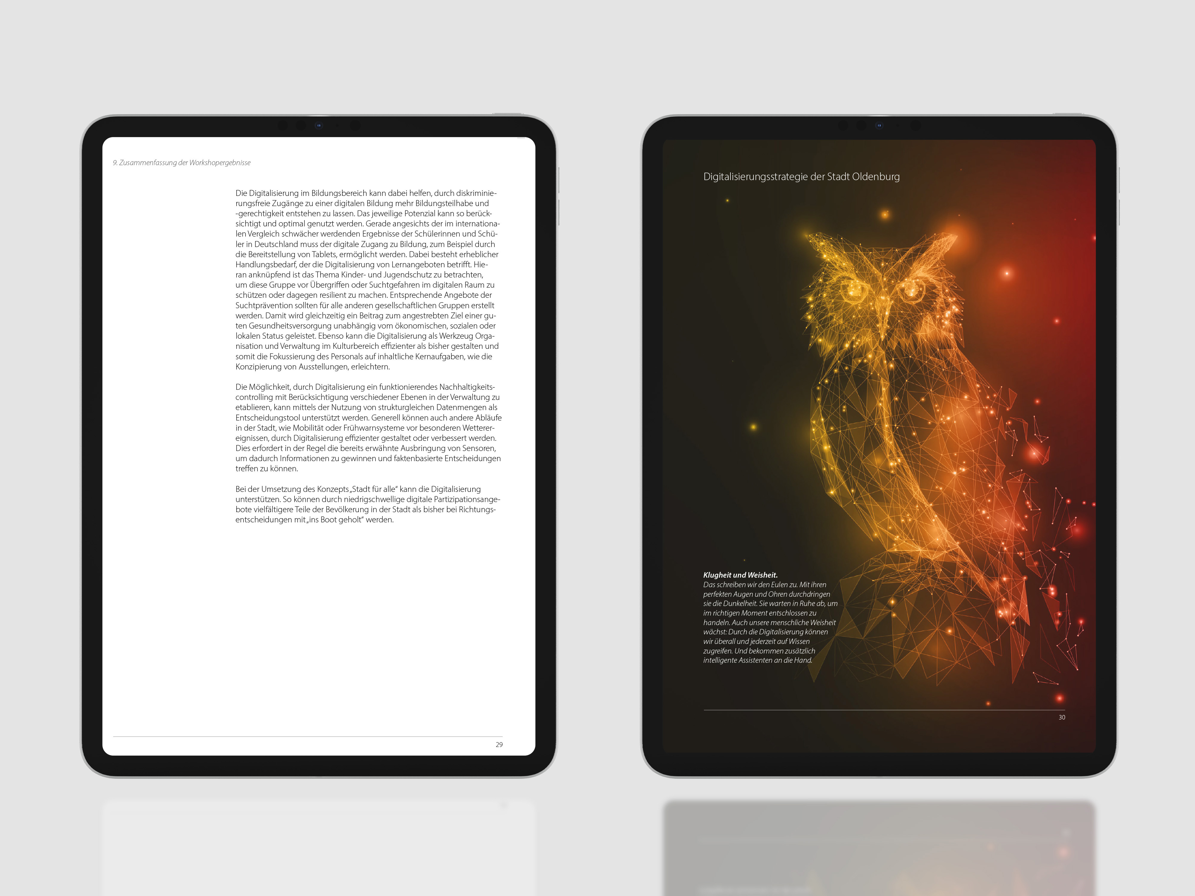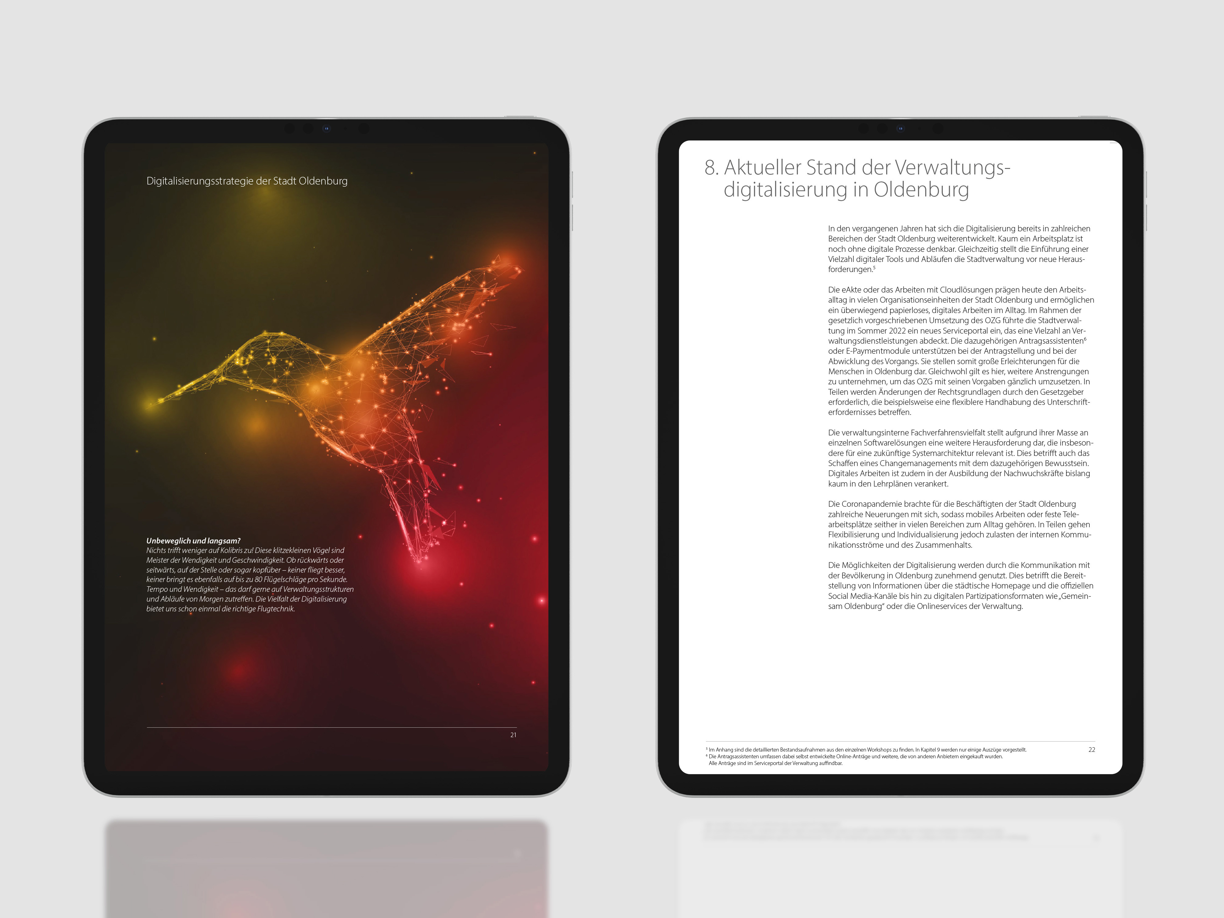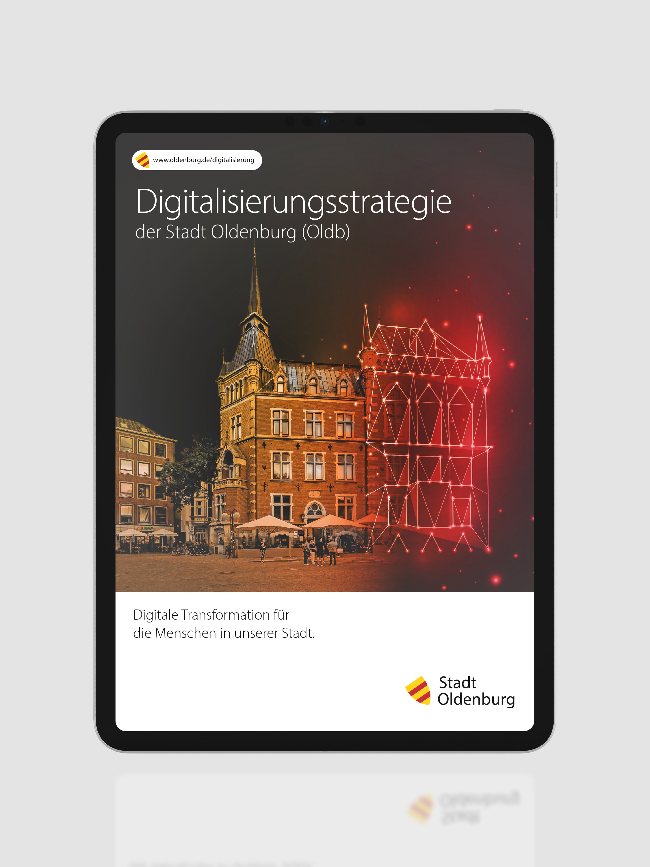 In vier sehr unterschiedlichen Bildansätzen wurden Veränderung, Digitalisierung und Zukunftsorientierung visualisiert. Die Stadt entschied sich für das Konzept einer polygonalen Tierwelt. Die einzelnen Tiere stehen symbolisch für digitale Kompetenzen. Eule, Adler, Kolibri und Schmetterling emotionalisieren die abstrakten Prozesse, verankern die übertragenen Bedeutungen und schaffen in der Summe eine starke visuelle Identität für das hochkomplexe Thema. Der Titel zeigt das Oldenburger Rathaus im Übergang in eine digitale Zukunft.