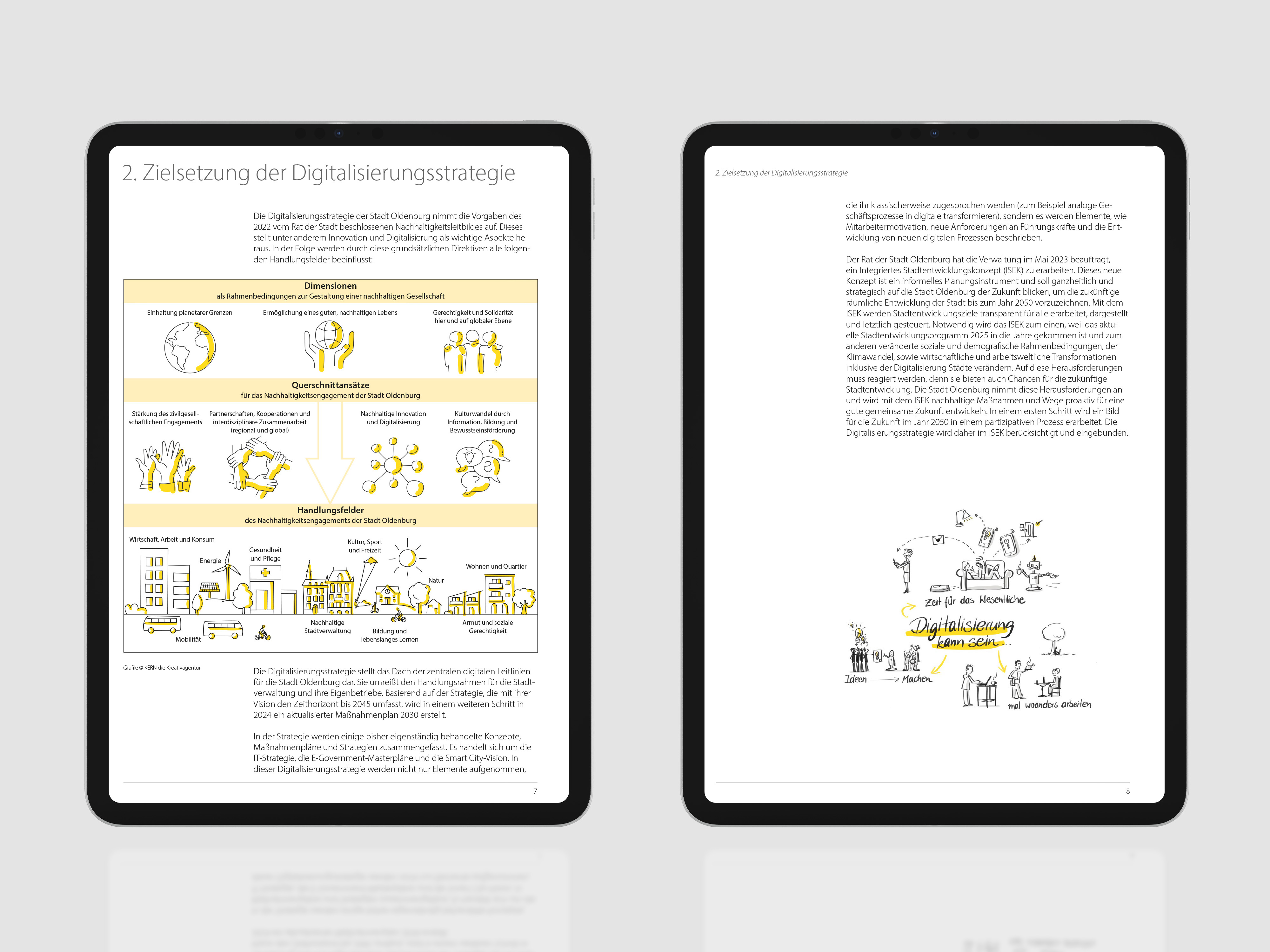 Die „Digitalisierungsstrategie der Stadt Oldenburg“ sollte in Form einer Online-Broschüre aufbereitet kommuniziert werden. Um die teils sehr komplexen Inhalte zugänglicher zu machen, wurde ein Bildkonzept gesucht, welches die abstrakten Konzepte nicht nur visuell auflockert, sondern Emotionen weckt und den digitalen Wandel greifbar werden lässt. Ziel war es, die Transformation der Verwaltung anschaulich darzustellen und die Leser:innen für das Thema Digitalisierung zu gewinnen.