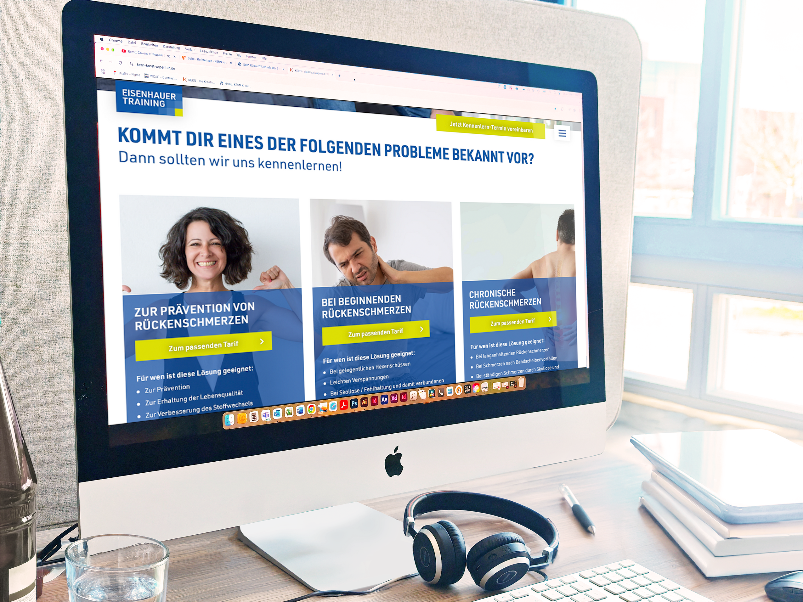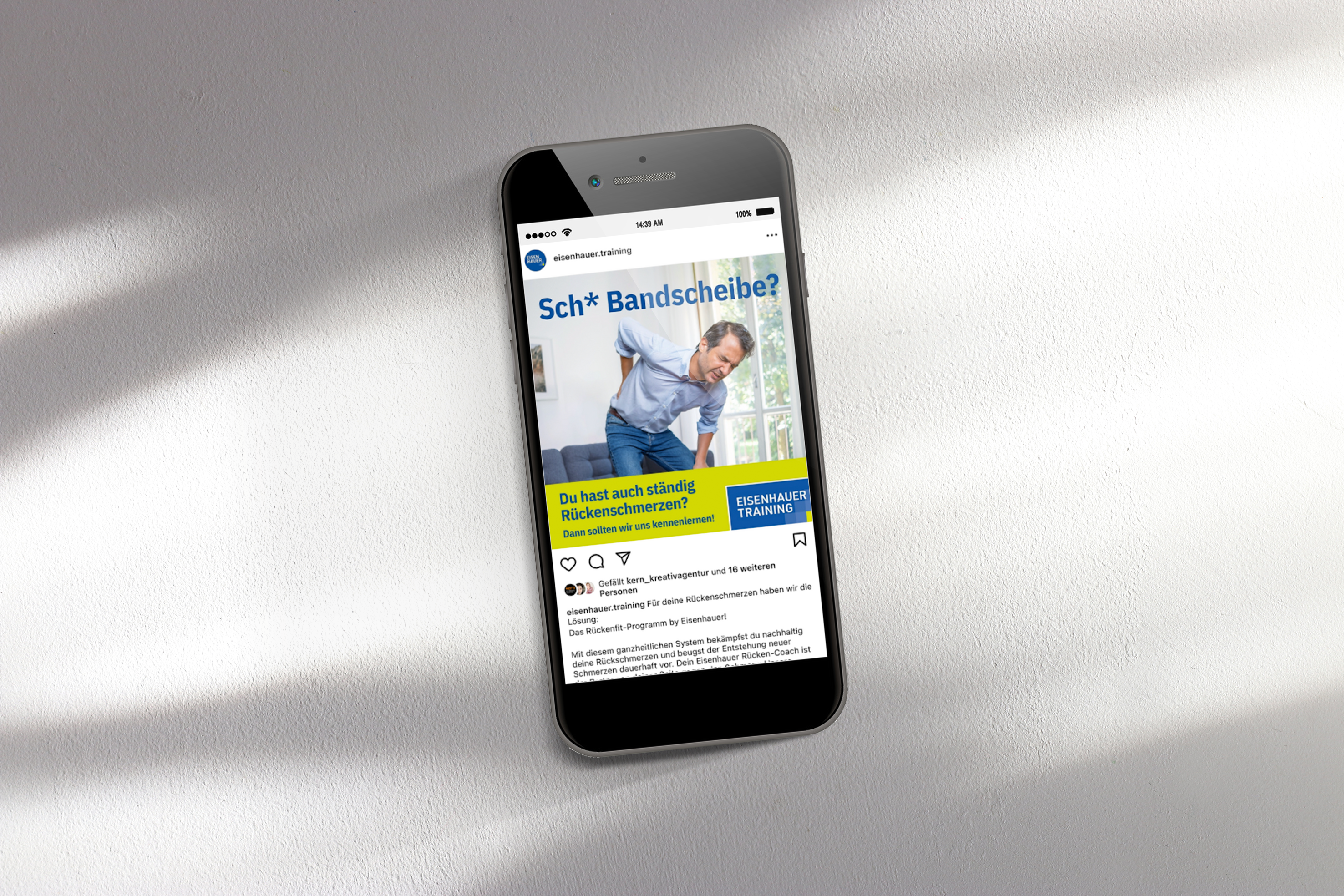 Seit 40 Jahren ist Eisenhauer mit seiner Trainingsmethode am Markt. Das Eisenhauer Rückenfit-Programm hilft nachhaltig gegen Rückenschmerzen. Als Fitnessstudio gegründet lag der Schwerpunkt bei Eisenhauer immer schon auf körperlicher Gesundheit durch richtiges Training. Jede:r sollte in der Lage sein effizient nach sportmedizinischen Grundsätzen zu trainieren, um mit einem ausgeglichen starken Muskelapparat und einem gesunden Rücken im Alltag leistungsfähig zu bleiben und Lebensqualität zu erhalten. Schmerzen zu reduzieren – vor allem im Rücken – steht dabei heute im Zentrum. Mit der Entscheidung, dieses auch in der Positionierung zu zeigen, löste Eisenhauer sich von seinem Selbstbild als Fitnessstudio. Diesen Weg begleiten wir strategisch und auch in der Umsetzung einer ganzheitlichen Markenkommunikation.